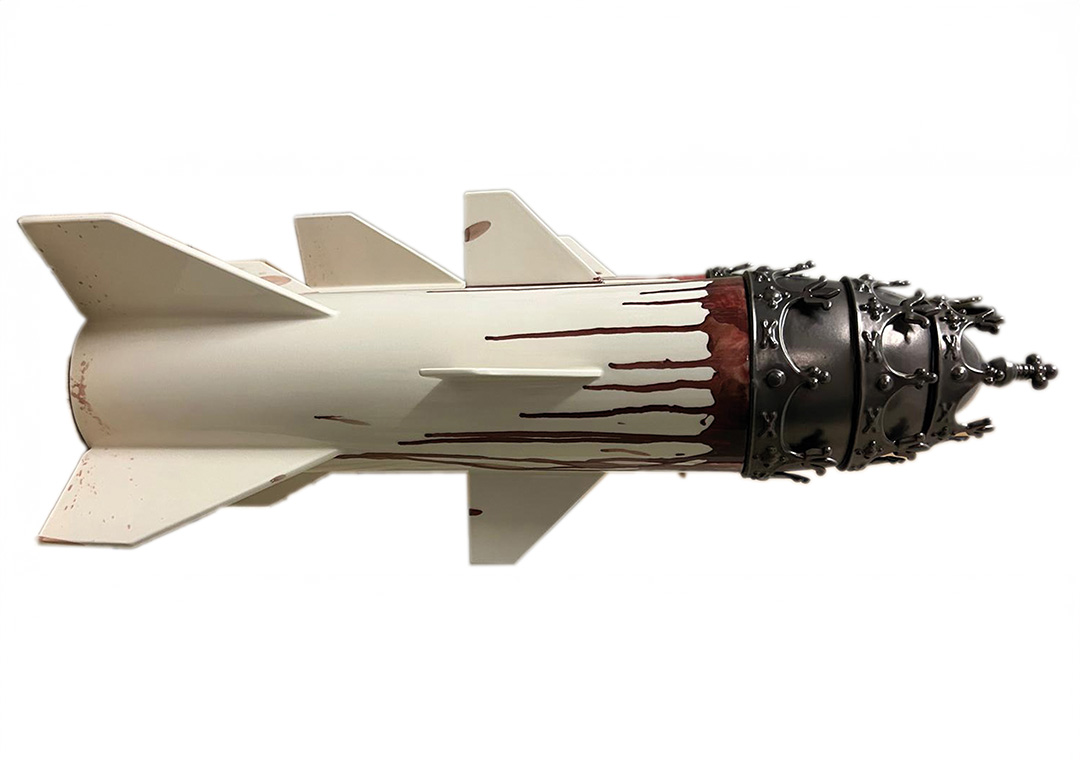 Diese Plastik in Form einer stilisierten modernen militärischen Rakete und einer historischen Tiara als Sprengkopf wurde 2025 im Rahmen der AoCG (Academy of Ceramics Gmunden) von Peter Baldinger entworfen.